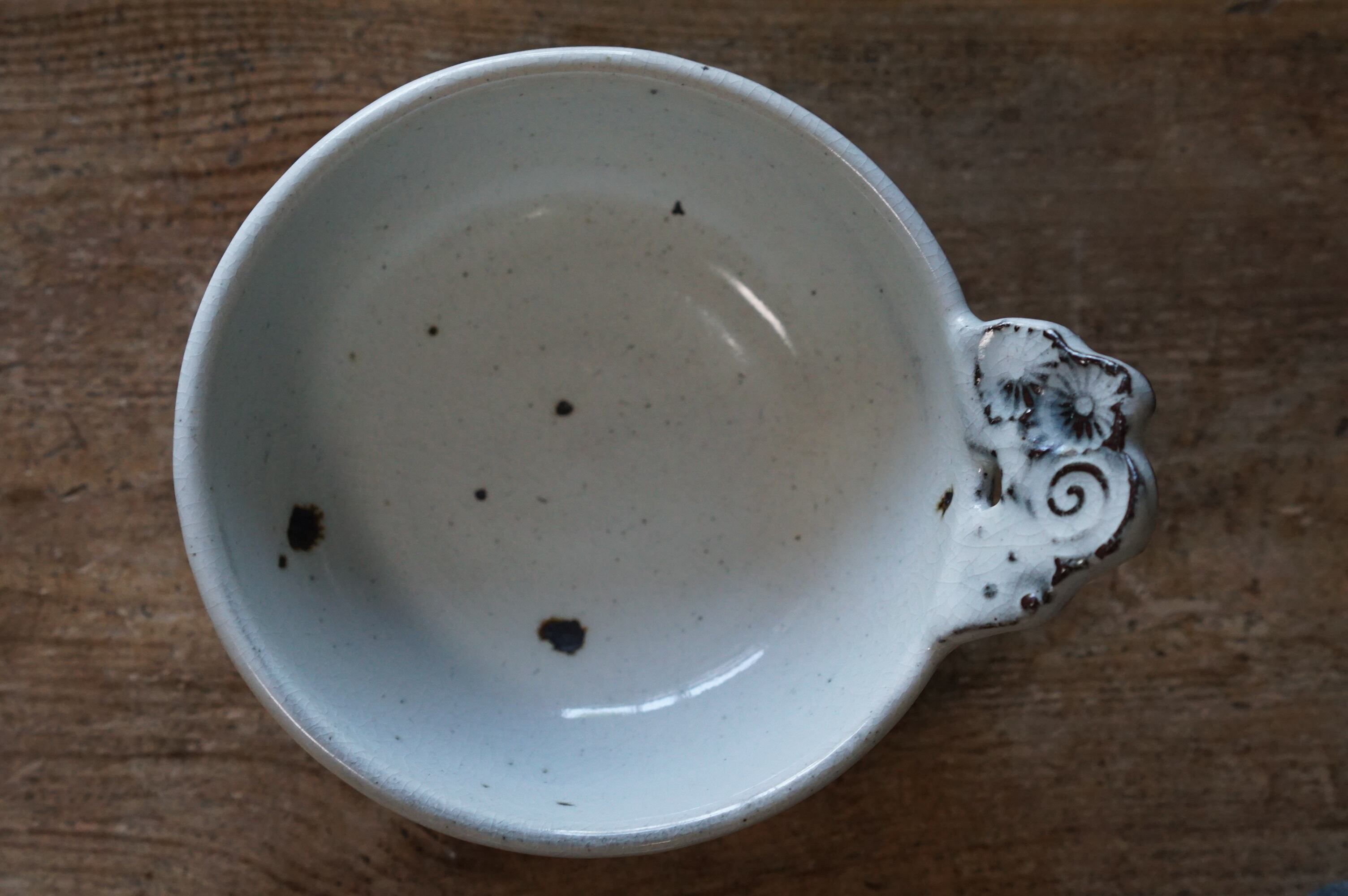 持ち手に印花を施したことにより 白化粧土で模様が浮かび上がります。